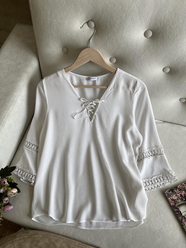 Шифоновая блузка молочного цвета с кружевом бренда Mango. Легкая и удобная. Идеально сидит по фигуре. Ткань приятная к телу. Размер по набору L. Замеры: 1/2 ОГ 51-56 1/2 ОТ 54-56 Длина по спинке 62 Рукав 45 Плечи 41-43 Рукав от шеи 54