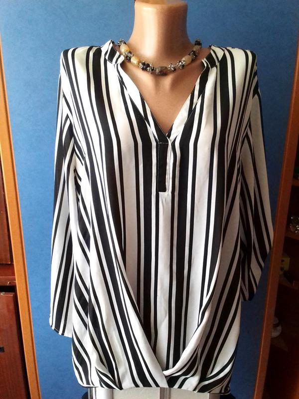 Красивая блузочка,белого цвета в черную полосу, впереди присобран в низу,рукава можно укорачивать,Впереди немного короче,сзади длиннее..Пог-62, Пот-62, низ62, длина-65, длина рукава-54, от плеча к плечу-42,длина по спине-68..