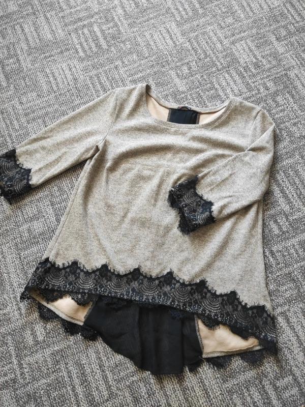 чрезвычайно красивая кофточка с кружевом. Период короче, зад немножко длиннее с разрезом. Все есть на фото.