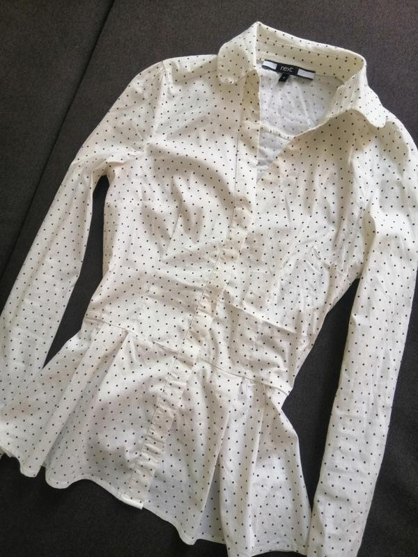 Женская блузка в горошек, цвет не белоснежный а нежный молочный, состояние идеально Ткань очень качественная, коттон 70% хорошо тянется, стрейчевая Бренд next Модель с баской Размер 36-38, Пог 42см, плечи 34см, рукав 62см, Талия 33см