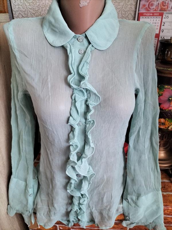 нежная мята, ткань в виде крепдишин, рубчик, перламутровые пуговицы, высокий манжет, который мягко и подворачивать,стан очень хорош плечи 40 пог 46 длина 62