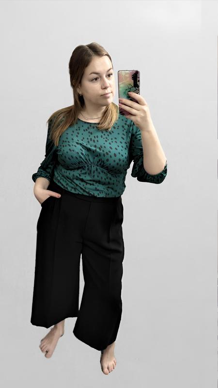 Блуза горох, ********** 18 р, гарно сідає і на 16 стан ідеальний ☺️ 95% поліестер 5 % еластан Плечі 42 Груди 54 Талія 49 на резиночці Довжина 65 Рукав 47, регулюється