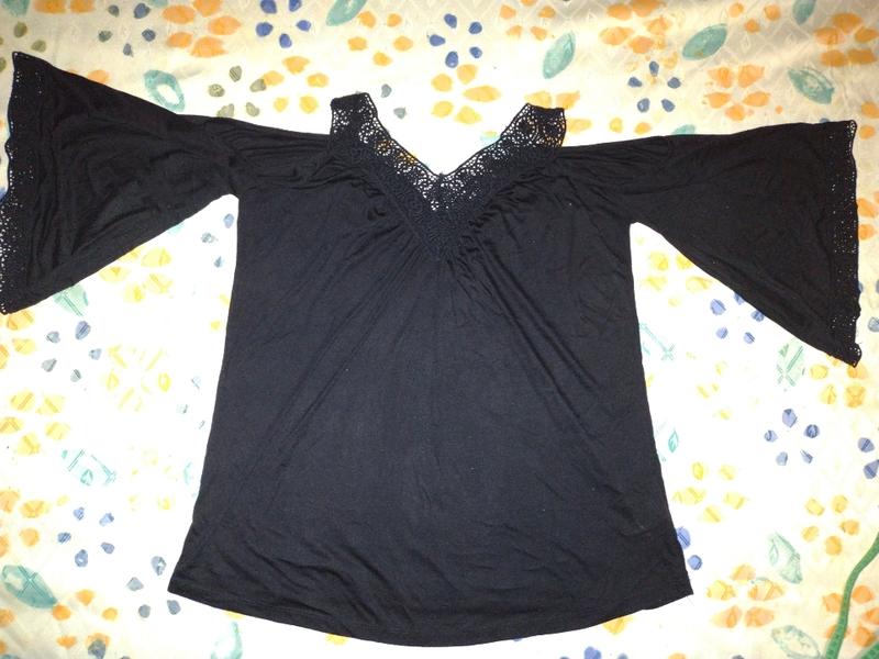 Віскозна кофтинка з відкритими плечима та мережевим декольте і шлейками, а також мереживо на рукавах. Вказаний розмір s, по низ 66см, довжина 70-72см