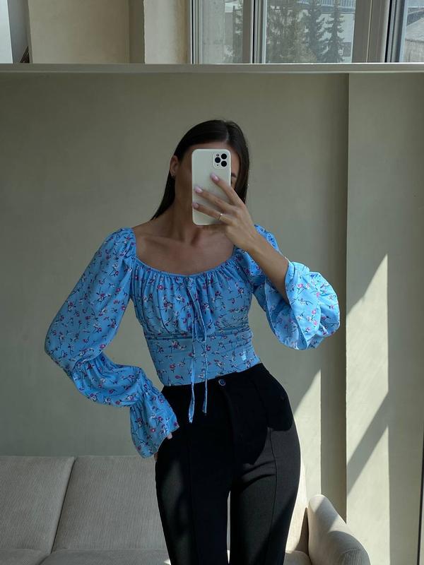 Фото реал🫶🏻 Блузка Мод. av 391 Цвета: голубой, белый Размеры: 42-44, 46-48 Тканина: штапель Блуза, которая затмит ваш гардероб😍 Милый женственный фасон, красивый цветочный принт, как не влюбиться в нее ❤️