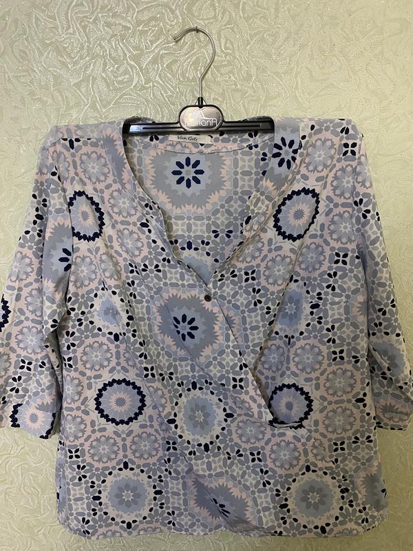 Ніжна віскоза блуза на запах. З переду є витачки. Гарна горловина з V образним вирізом. Рукав 3/4, має манжет. Заміри: пог - 55, довжина - 60