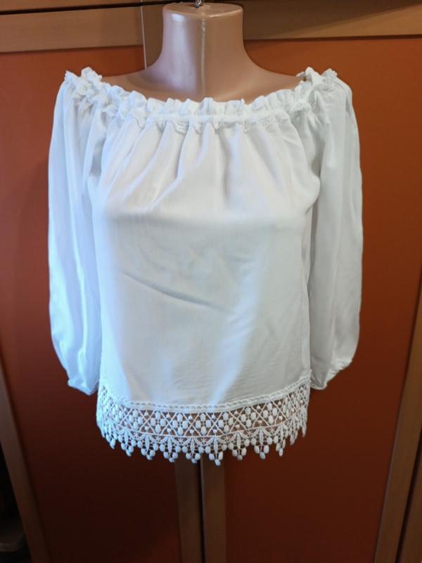бiла укорочена з мереживом,Котон, тканина бомба дуже тоненька, розмiр 36 -38,прямого крою,довжина44,груди 52, талия 52, рукав 46 вiд горловини , Италия