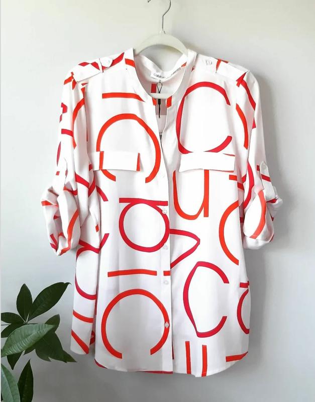 Блузка с принтом, рукав подкачивается. Ворот стойка. Длина общая:68;длина рукава-60;плечи-58;бицепс-19,5;обг.--58