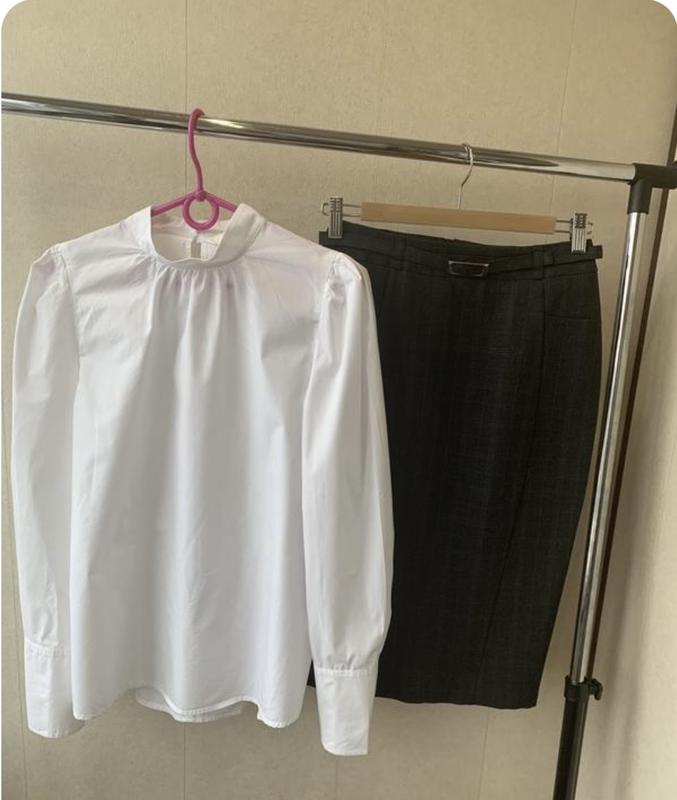 Стильная белая блуза. Модель прилегающего силуэта, воротник - стойка, длинные объемные рукава с широким манжетом Отлично сочетается с юбкой или брюками UK 10 цена 350 грн ОГ 100 см ОТ 108 см ОС 112 см Длина 60 см Плече 34 см Длина рукава 65 см Ширина рукава 40 см