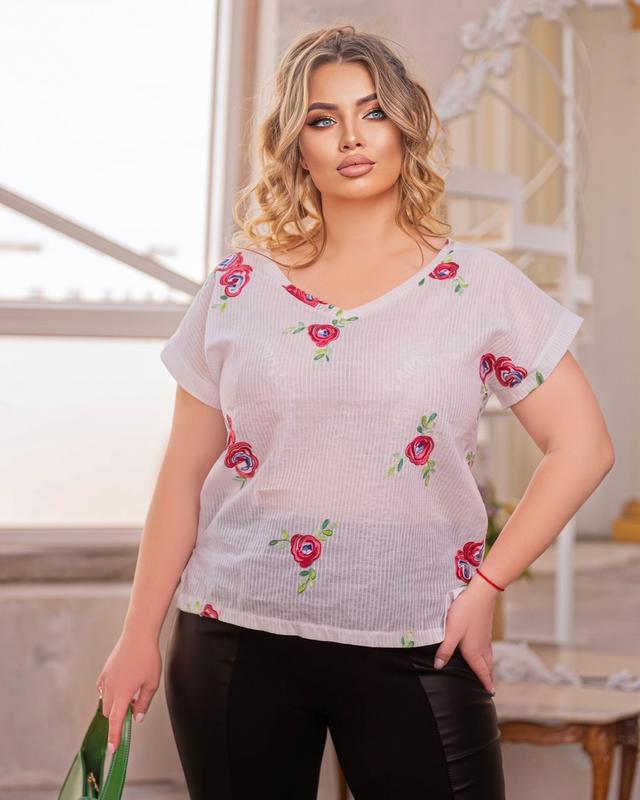 Размеры 46-48,50-52,54-56,58-60 Цвет: белый Ткань: полупрозрачный коттон Принт: машинная вышивка цветы. Свободная блуза с V-образным вырезом, приспущенные плечи. Брюки есть в продаже. Фото и видео вживую. Параметры модели ОГ110, ОТ86, рост 165см, на ней 50-52. Лосины есть в продаже отдельно. Параметры изделия: 46-48: ОГ98, ОТ100, рукав 24см, длина 66см; 50-52: ОГ108, ОТ110, рукав 25см, длина 67см; 54-56: ОГ118, ОТ120, рукав 25, длина 69см; 58-60: ОГ128, ОТ130, рукав 25см, длина 70см. вл