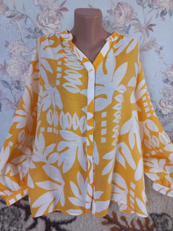 Красивая блуза большого размера с интересными рукавами.Нюанс на последних двух фото. Поэтому цена символическая Длина 70см, плечи 44, пог 64, рукав 60