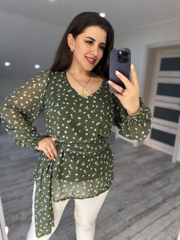 Модель 833VL Розміри :50-52,54-56,58-60 Тканина: шифон, літня трикотажна підкладка Кольори: чорні квіти, сині квіти , оливкові квіти , білі квіти, бежевий, бірюзовий. Вільна блуза, з боків розрізи, талія фіксується поясом з основної тканини( пояс входить в комплект), довгий рукав, на лікті ряд резиночек, на грудях виріз. Параметри моделі 108-86-108 на ній представлений розмір 50-52. Параметри блузи по зовнішньому шву: 50-52: ОГ 114, ВІД114, ОС120, рукав 62см, довжина блузи по спинці 74см; 54-56: ОГ120-ОТ120-ОС134, рукав 63, довжина 74см; 58-60: ОГ128-ОТ130-ОС150, рукав 64, довжина 79см.