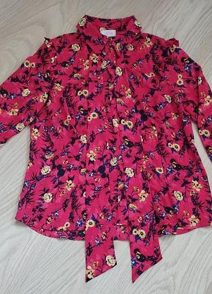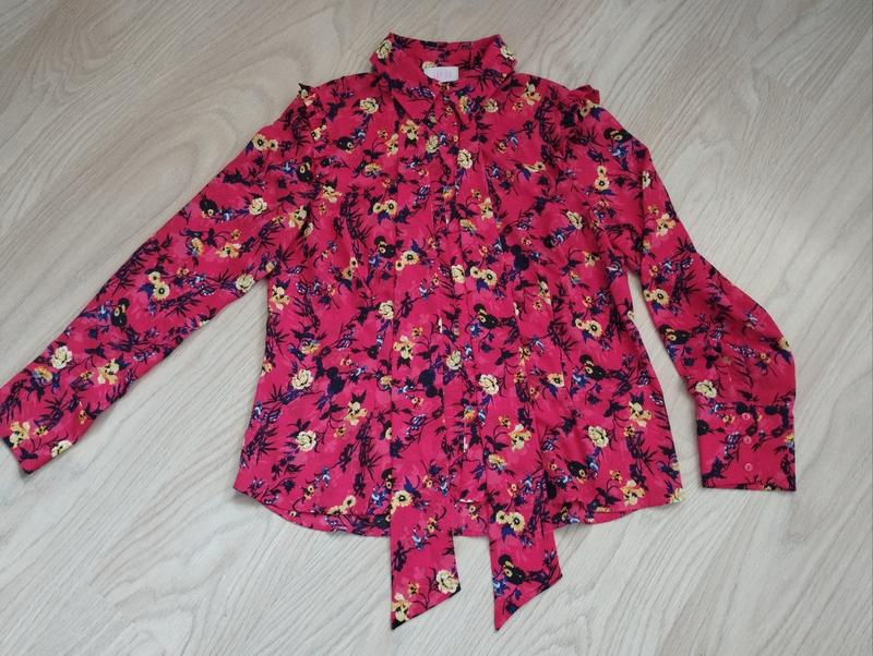 Яскрава блуза 40-42 стан нової, на червоному фоні квітковий прінт, спереду на гудзиках плюс гарна стрічка, тканина прохолодна і падаюча, дуже приємна до тіла