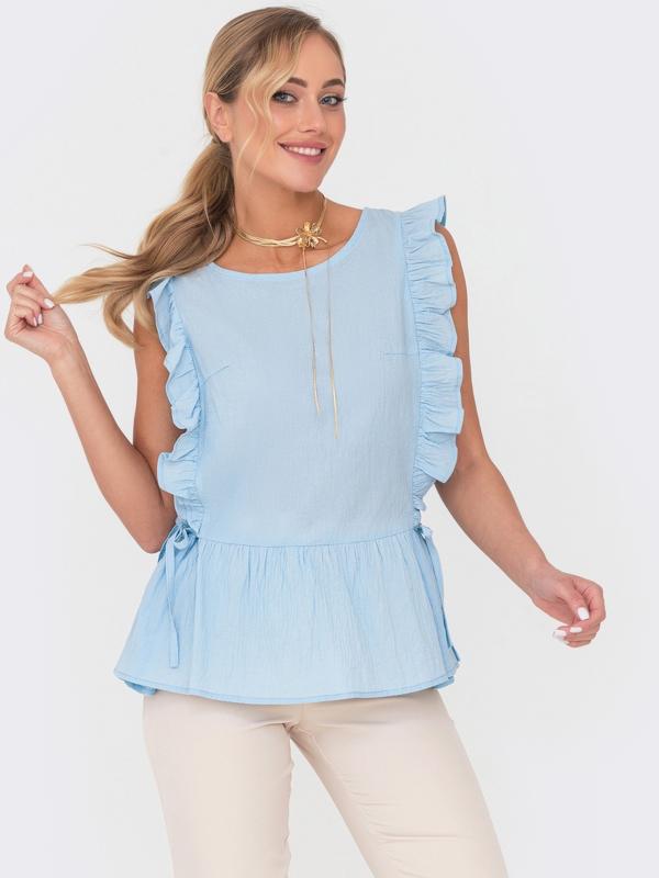Стильная блуза без рукавов. Изделие с круглой горловиной. Сбоку дополнена рюшами и завязками. Подол с оборкой.