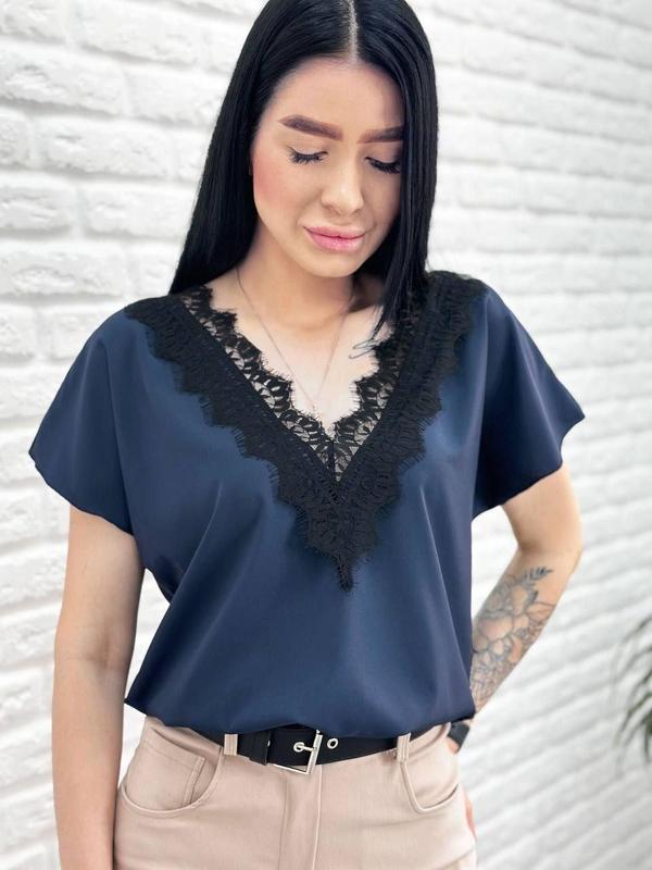 Жіноча блузка з вирізом та мереживом Жіночий декор у вигляді мережив, воланів та драпіровок - один з основних модних трендів 2023 року. Новинка - літня блузка - поєднує у собі улюблений модницями вільний крій, спокусливий виріз декольте та мереживне оздоблення з зухвалим необробленим краєм. Характеристики моделі Дизайн нової жіночої блузки має декілька особливостей: - - прямий вільний фасон; - - короткі рукави, що злегка прикривають плечі; - - глибокий V-подібний виріз декольте; - - оздоблення лінії декольте мереживом з необробленими краями (ширина мережива - 6 см). Блузка представлена у чотирьох базових кольорах, тому її зручно вдягати під ділові костюми та жакети. Стримана палітра дозволяє вибрати свій відтінок будь-якій модниці, незалежно від віку та типажу. Блуза виготовлена з софту та мережива. Софт не вимагає особливого догляду, але для збереження цілісності обробки виріб потрібно прати у делікатному режимі та у спеціальному мішку для прання. Допускається також ручне прання. Температура води має бути не вище 30-35 градусів. Характеристики - Стиль:Casual - Сезон:Літо - Довжина від плеча:61-63 см - Матеріал:Софт ТАБЛИЦЯ РОЗМІРІВ Розмір Обхват грудей Обхват талії Обхват бедер 40 74-80 60-65 84-87 42 82-85 66-69 88-91 44 86-89 70-73 92-94 46 90-93 74-77 95-98 48 94-97 78-81 99-103 50 98-102 82-85 104-107 52 103-107 86-90 108-111 54 108-111 91-94 112-116 56 112-115 95-98 117-119