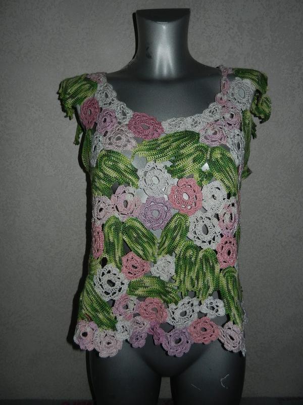 Блуза выполнена по технике ирландского кружева. Вывязаны отдельные элементы и соединены в единое полотно с помощью иглы. Нитки: 100% хлопок. Возможно другое сочетание цветов. Цена может меняться в зависимости от размера. Все изделия вяжу исключительно в одном экземпляре. Авторская работа. Возможен индивидуальный подбор цвета и фасона на ваш вкус.Точно повторить невозможно, свяжу похожее. Все работы в единственном экземпляре! Цена указана из рассчёта 100 $ Данная блуза идет на размер UK-12/EUR-40,наш 46(M) НОВАЯ!
