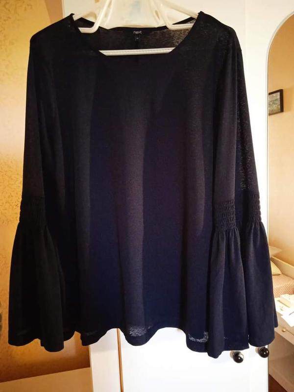 Очень красивая эффектная блуза темно-синего цвета с широкими воланами на рукавах. Прекрасно выглядит, хорошо тянется. Состояние новой. Английский размер 20, европейский 48, красиво тянется, отлично подходит с 54 по 58 размеры. Прекрасная качественная женственная вещь. По дополнительным замерам, убедитесь пожалуйста, с удовольствием ответьте.