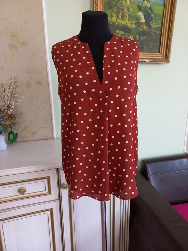 блуза из искусственного шелка, терракотового цвета в горох (последнее фото ближайшее передало), новая без бумажной бирки( сток ) 12 р- р, длина 64/70, ПОГ 50