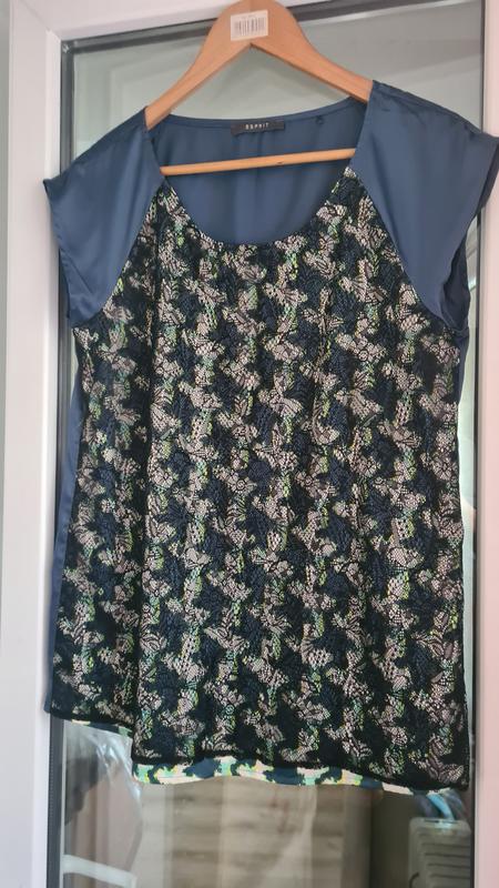 Летняя блузка esprit. тканиеа под атлас. Кружево спереди. Темно-зеленого цвета. Размер 40. Стан - идеальный. Состав на фото