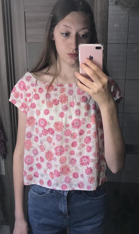 размер s-m идет чуточку укороченная можно носить как обычную футболку, так и с открытыми плечами. на лето очень классный вариант!