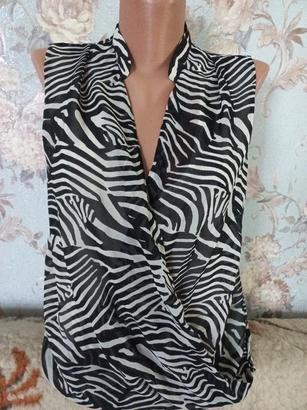 Красивая блузка, легкая, передняя полочка двойная как бы с маечкой поднизом. Новая, еще с бирочкой. Длина впереди 57см, сзади 63см, плечи 32см, пог 45