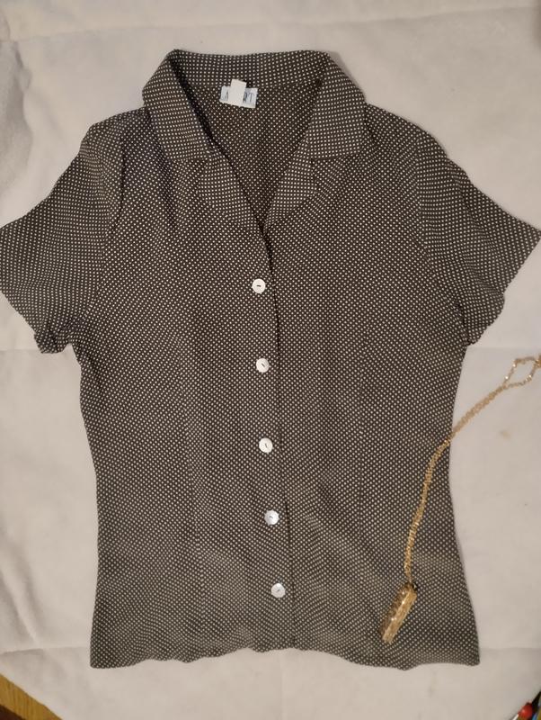 блуза легка, приємна до тіла, без дефектів, коричнева в білий горошок, на гудзиках і кнопка зверху потайна Ширина плеча 11 см Довжина рукава 17 см Пог 48 см Пот 40 см Довжина 60 см Є ще тоненький пояс на талії позаду і кнопка над верхнім гудзиком, щоб сильно не відкрите було 100% віскоза =========== Річ до секонду відношення немає. У зв'язку з введенням Шафи послуги продажу знімається з продавця 10-14 % комісії за продаж з кожної речі відповідно по вартості, товар виставляється у продаж вже з остаточною ціною без торгу. Дякую за розуміння.