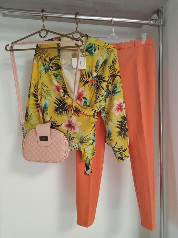 Стильна блузочка з оригінальним квітковим малюнком на жовтому фоні. Легка та зручна. Приємна на дотик. Тонка, але щільна тканина. Не просвічується. Практично не тягнеться. Лягає по фігурі. Фасон на запах. Зав'язується по заду. Укорочена. Укорочений широкий рукавчик 3/4. Є розміри.