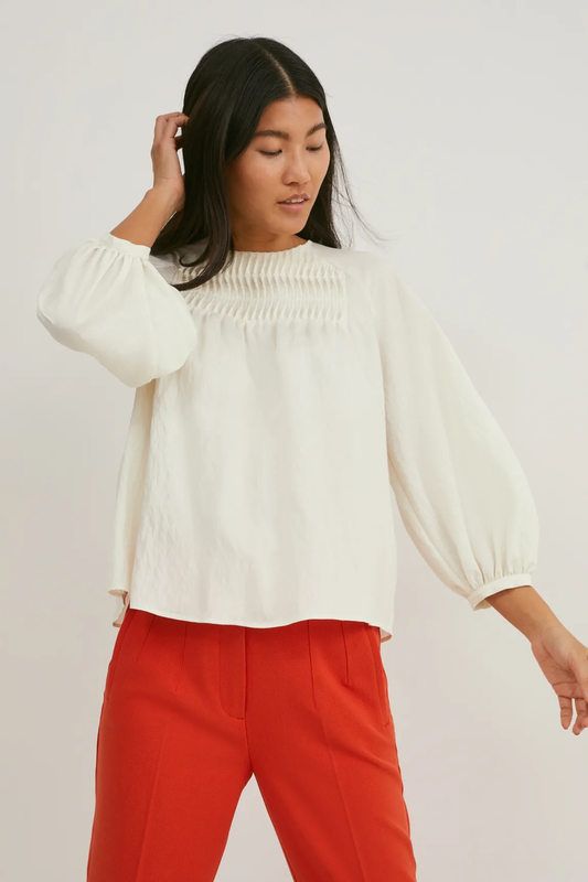 Красивая блуза, объемный рукав, цвет молочный, приятная ткань, состояние идеальное. Пог. 60, рукав с начала горловины реглан 64, длина 67.