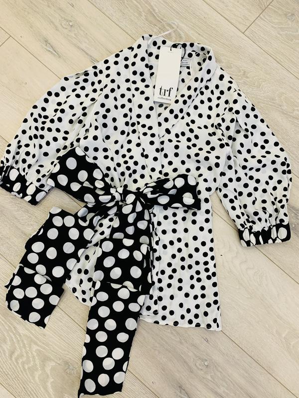 Кружевная блуза в горох от бренда Zara Блуза на запах имеет длинный пояс который можно обернуть вокруг талии и завязать на бант На рукавах резинка , рукав 3/4 Размер XS подойдет и на S