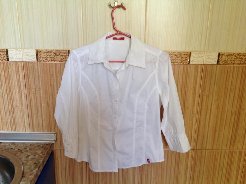 Блузка/9 с рукавом 3/4.По бокам чуть короче,впереди и сзади длиннее.Впереди на полочках по две рельефные выстрочки справа и слева от застёжки.На спине 2 рельефные выстрочки.Очень приятная к телу.ПОГ 46.5 см,ПОТ 42 см,длина рукава от шеи 54 см,длина изделия по спине 56 см.Смотрите мои другие объявления.