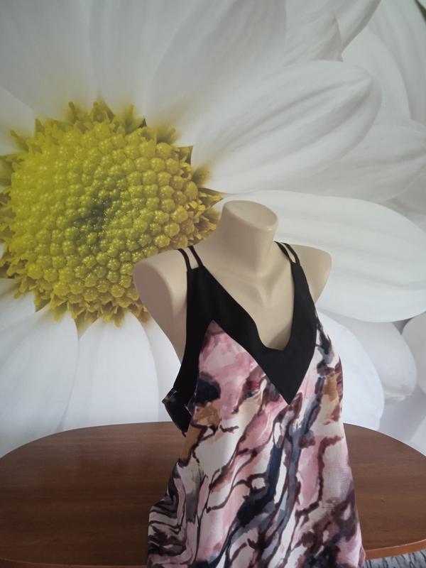 Классическая блузочка на тонких бретелях с оригинальным контрастным рисунком. Стильно сочетаются цвета. Легкая и удобная. Приятная на ощупь. Тонкая, но плотная ткань. Не просвечивается. Практически не тянется. Ложится свободно. Фасон-легкая трапеция. Есть размеры.