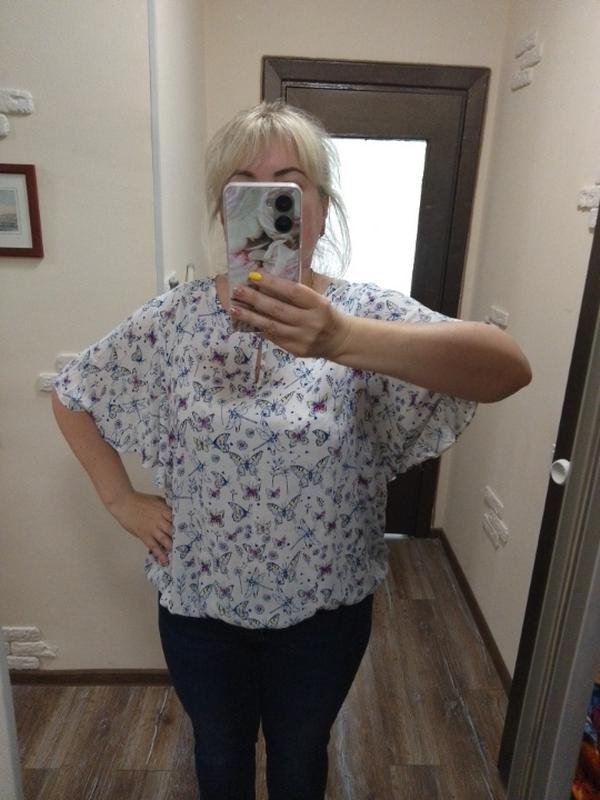 Романтичная блуза, идеальная, рукава крылышки, низ на резинке. На наш размер 54-56. Длина 65, ПГ 65, низ 67. Легкая, приятная ткань.