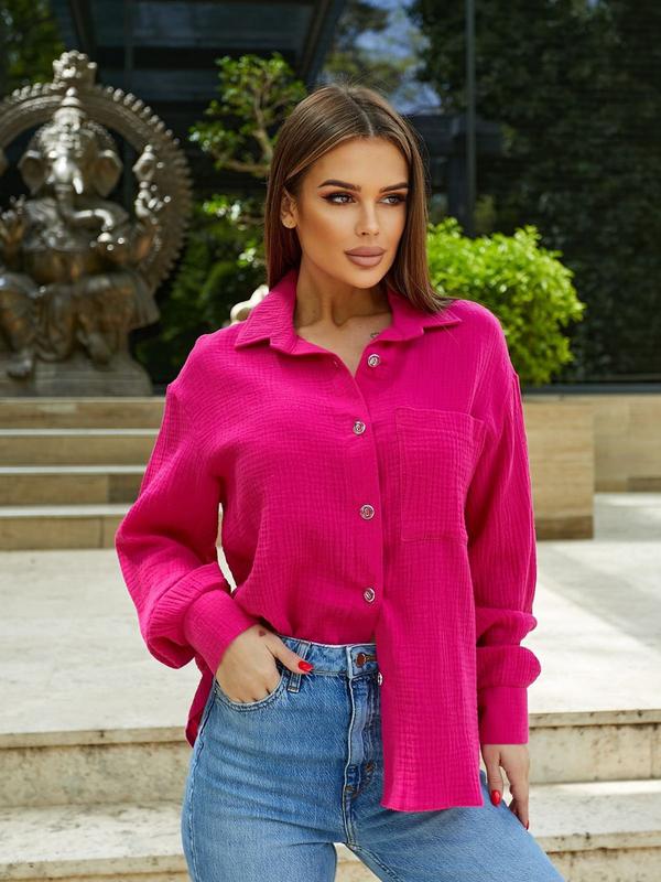 Муслінова сорочка вільного крою. 💜Сорочка вільного крою . На рукавах та по усій довжині наявні гудзики . 💜Розміри: 42 ,44, 46, 48 💜Тканина: муслін 💜Кольори: моко, чорний, малина, білий, зелений Заміри обхвату: груди/довжина/рукав 42р-100/63-67/52 44р-104/67-71/52 46р-108/69-73/52 48р-112/70-74/52