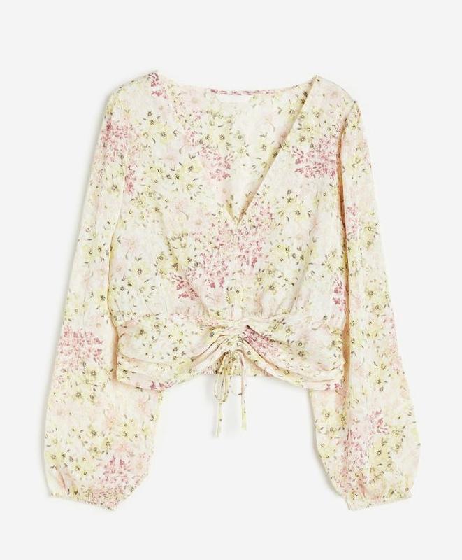 Ніжна квіткова блуза з останніх колекцій відомого бренду. Спереду є завʼязки, ззаду на талії є резинка. Тканина не тягнеться. Нарівобʼєм грудей: 63 см, напівобʼєм талії: 49 см (тягнеться до 55 см), плечі: 44 см, довжина рукава від плеча: 61 см, довжина блузи по спинці: 49 см.