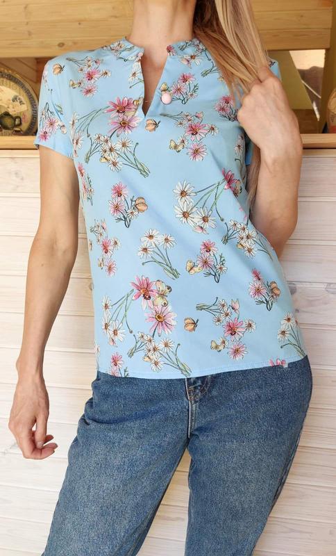 Легкая женская блузка с цветочным принтом 🌸 Стильная блузка нежно-голубого цвета с ярким цветочным узором - идеальный выбор для теплого времени года. Модель имеет аккуратный вырез с декоративной планкой на пуговицах, короткий рукав и женственный силуэт. Характеристики: 📏 Размер: 36 (на грудь 45–46 см) 📐 Длина: перед - 60 см, спинка - 65 см 👕 Состав ткани: 70% вискоза, 30% хлопок - ткань мягкая, приятная к телу, хорошо дышит 🎨 Цвет: голубой с цветочным принтом 🧵 Фасон: свободного кроя, без подкладки Преимущества: Идеально подходит для повседневной носки, прогулок или офиса Натуральные волокна в составе обеспечивают комфорт в жаркую погоду Хорошо комбинируется с джинсами, юбками или шортами 📦 Готова к отправке. В наличии ограничено количество!