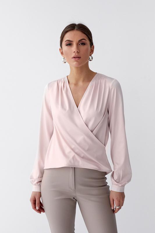 Блуза вільного крою, виготовлена на запах. Пілочка з нагрудними складками від рівня плеча. Рукава втачні, довгі закінчуються вузьким манжетом із застібкою на гудзики. Лінія низу пілочки вище низу спинки. Замовлення можна оформити через Вайбер Найбільший асортимент якісного жіночого одягу на нашому сайті ********** Розмір підбирайте відповідно таблиці: (також обов'язково враховуйте заміри виробу, що вказані в характеристиках товару)