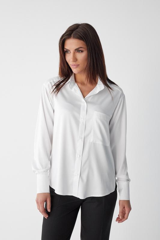 Сорочка вільного крою із сорочковим коміром. Лінія плеча приспущена. Рукава втачні, довгі, закінчуються манжетами і застібаються на гудзики. Пілочка та спинка виконані з кокеткою. Плечового шва немає. Спинка із зустрічною складкою. Пілочка з однією кишенею та планкою на ґудзиках. По бічних швах - розрізи. Оздоблювальну строчку прокладено по кокетці, проймі рукавів, по планці, на кишені та по низу виробу. Замовлення можна оформити через Вайбер Найбільший асортимент якісного жіночого одягу на нашому сайті ********** Розмір підбирайте відповідно таблиці: (також обов'язково враховуйте заміри виробу, що вказані в характеристиках товару)