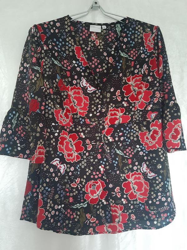 Женская красивая качественная блуза батал датского бренда JUNAROSE. Цветочный принт с бабочками свободного кроя с отрезной линией под грудью и по спине. С v-вырезом. От груди идет свободной трапецией. Спереди на пуговицах по всей длине. Гудзики обтянуты тканью. Рукав 3/4. Ткань приена на ощупь, легкая, не просвечивается. Цветы не такие ярко красные. Подойдет к однотонным базовым вещам большой палитры цветов, придаст им изюминку. Например: белых, черных, синих, голубых, красных, бордовых, зеленых, розовых, салатовых брюк, юбочек, пиджаков и джинсовых курток. Состояние новой. Без нюансов. Ширина плечей - 42 см 1/2 ОГ - 60 см 1/2 под грудью - 56 см От плеча до линии под грудью - 38 см Ширина по краю - 91 см Длина рукава - 44 см Ширина оборки рукава- 15 см Длина блузы спереди - 72 см По спине - 76 см Сделаю дополнительные замеры и ответь на вопросы.