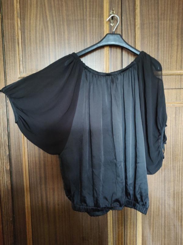 оригинальная блузка, атласная основа, рукава шифоновые. за счёт оригинального кроя хорошо ложится и скрывает недостатки фигуры. очень приятная к телу, не парит в жару пог75 пот 47/64 длина 66
