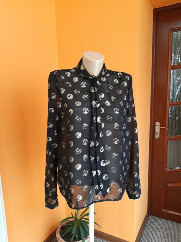 стильная блуза в красивом состоянии, плечи 40, пог 52, поб 54, длина 60,рукав 62, кружочки на ней серебристо бежевые,не полностью серебристо
