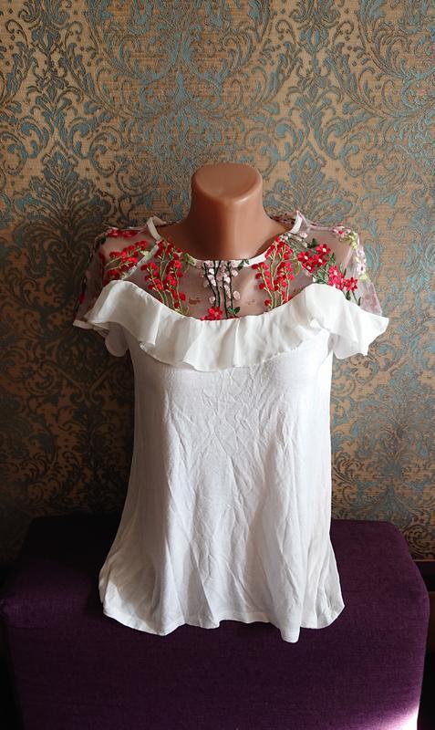 Красивая футболка со вставкой сеточка вышивка, есть нюанс см. фото дырочки на сеточке Размер 12 наш 44 /46/48 Замеры Длина ок 62 Пог 50