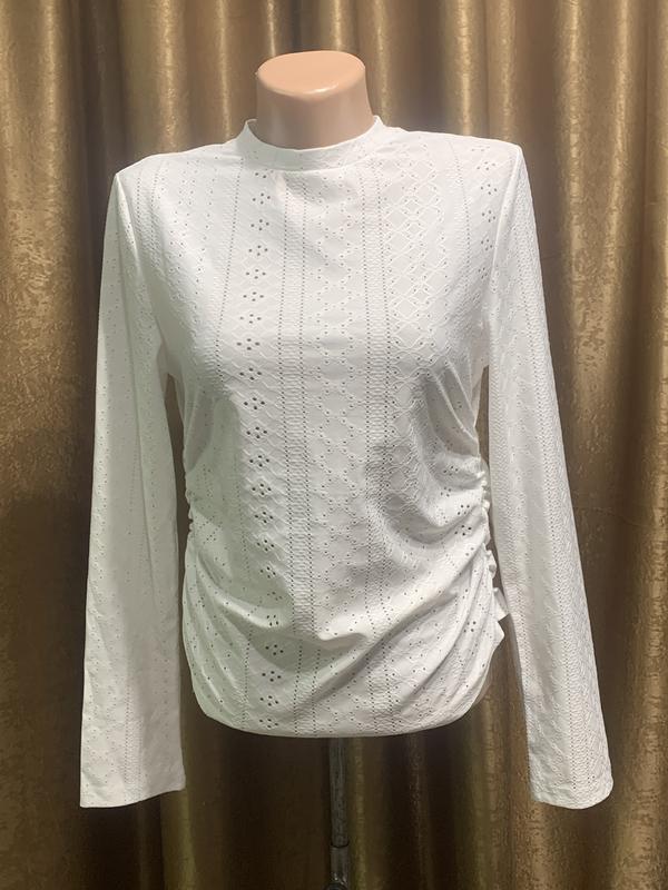 Белая ажурная блузка под прошву с длинным рукавом Размер L Длина 60см Длина рукава от плеча 62см, от горловины 74см Полуобхват груди 45-55см Полуобхват талии 38-47см Полуобхват бёдер 44-54см Китай По бокам присобрано на резиночках Состав 95% полиэстер, 5% эластан, отлично тянется Б/ у , идеальное состояние и супер качество
