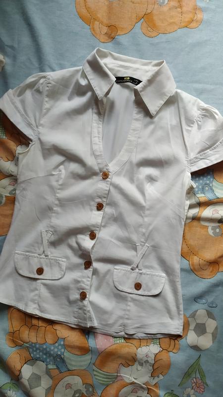 Ткань тонкая и приятная на ощупь, немного тянется. Состояние очень хорошее, белое, без пятен и повреждений. Карманы - обманки есть шлевки для ремешка. Размер Л длина-56 ширина-40 плечі-35 рукав-13