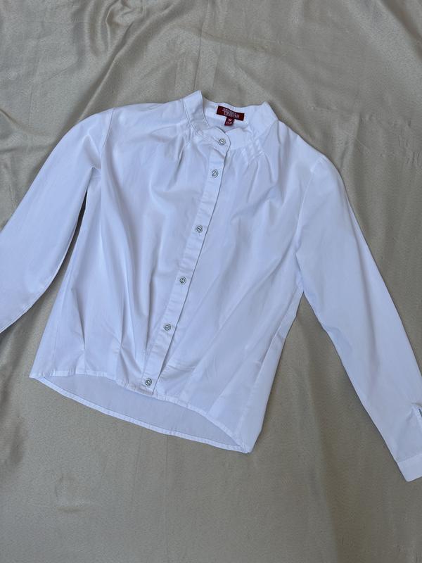 Неймовірно гарна, якісна, білосніжна сорочка. Дуже красиво виглядає одягнена, ідеальний стан. Заміри: Довжина- перед- 47см, зад- 54см Плече- 11см Рукав- 55см ПОГ- 45см ПОТ- 44см Низ- 43см Від плеча до плеча по спинці- 35см