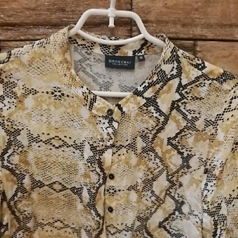 Блузка в змеиный принт.Довгой рукав. Воротничок стойка. Ткань очень приятная. Легкая. Состав не знаю, но точно - натуральный Подойдет на размер наш М или Л.