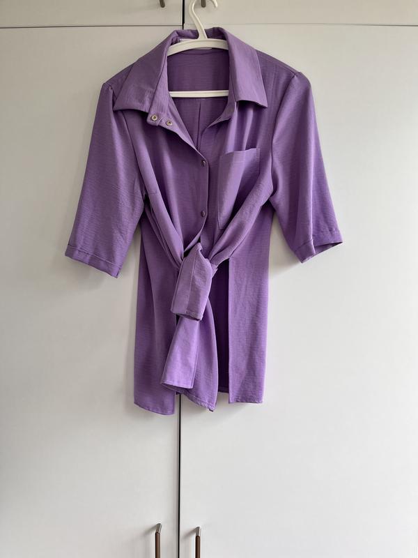 Блуза сиреневого цвета, новая. К ней есть в комплекте белый топ на бретельках. Блузу можно завязывать спереди, носить расстегнутую с топом, или как классическую рубашку.