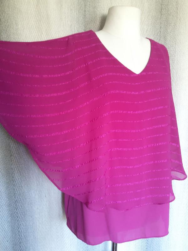 Женская нарядная блуза, блузка цвета фуксии. двухслойная, цвет на фото, замеры: нижнего слоя: плечи 36 см, ширина плеча 6 см, горловины 24 см, НО груди 51 см, НО талии 51 см, НО низа 56 см, НО проймы 26 см. Длина 67 см. верхнего слоя: ширина плеча 24 см, длина 56-57 см. не тянется, состояние нового.