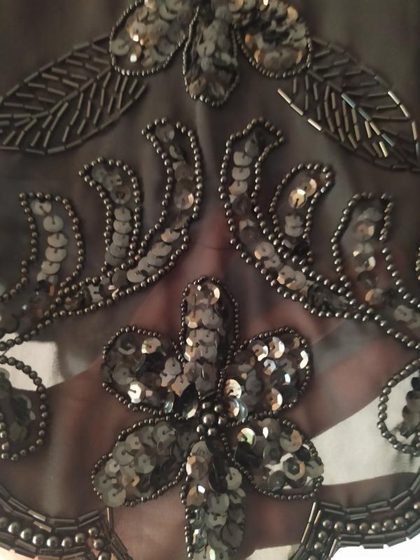Черная шифоновая блуза вся расшита бисером и паетками..На подкладе, , на спине змейка. Блуза не длинная , тяжелая , не менее 1-1.5 кг.