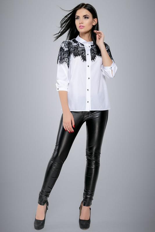 В новой коллекции Elite blouses интернет-магазина ST-SEVENTEEN представлена восхитительная модель белой блузы с изысканным оформлением в виде черного кружева. Ажурные вставки расположены в области декольте и полностью закрывают плечи. Это привносит в образ нотку самобытности и магического очарования. Белая блуза отменного качества от производителя сделает любой образ комфортным и запоминающимся. Ее можно надеть на работу, учебу или любое торжественное мероприятие. Полуприлегающий крой модели выгодно подчеркивает все формы фигуры. Тактильно приятный и прочный софт обеспечит удобство и неприхотливость ухода за вещью. Немного смелости и дерзости в образ добавляют строгие манжеты на рукавах длиной три четверти и воротник-стойка.