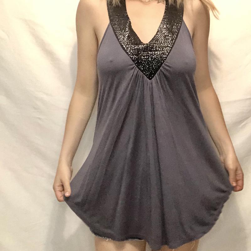 серая блуза с паетками без рукавов и открытой спинкой 🩶 бренд Just Ginger размер s-m материал искусственный шелк, очень приятная к телу пог 40см длина 76см