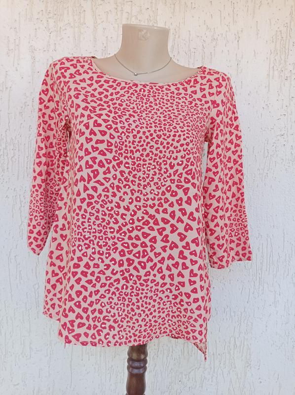 Легкая блузка свободного кроя из вискозы в идеальном состоянии. Длина 56/66, ПОГ 42, рукав 41, плечи 34, принт сердечко. Хороших вам покупок.